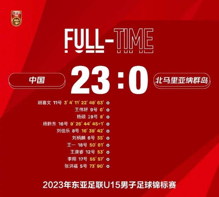 2023年,东亚足联U15男子足球锦标赛,中国23-0北马里亚纳群岛